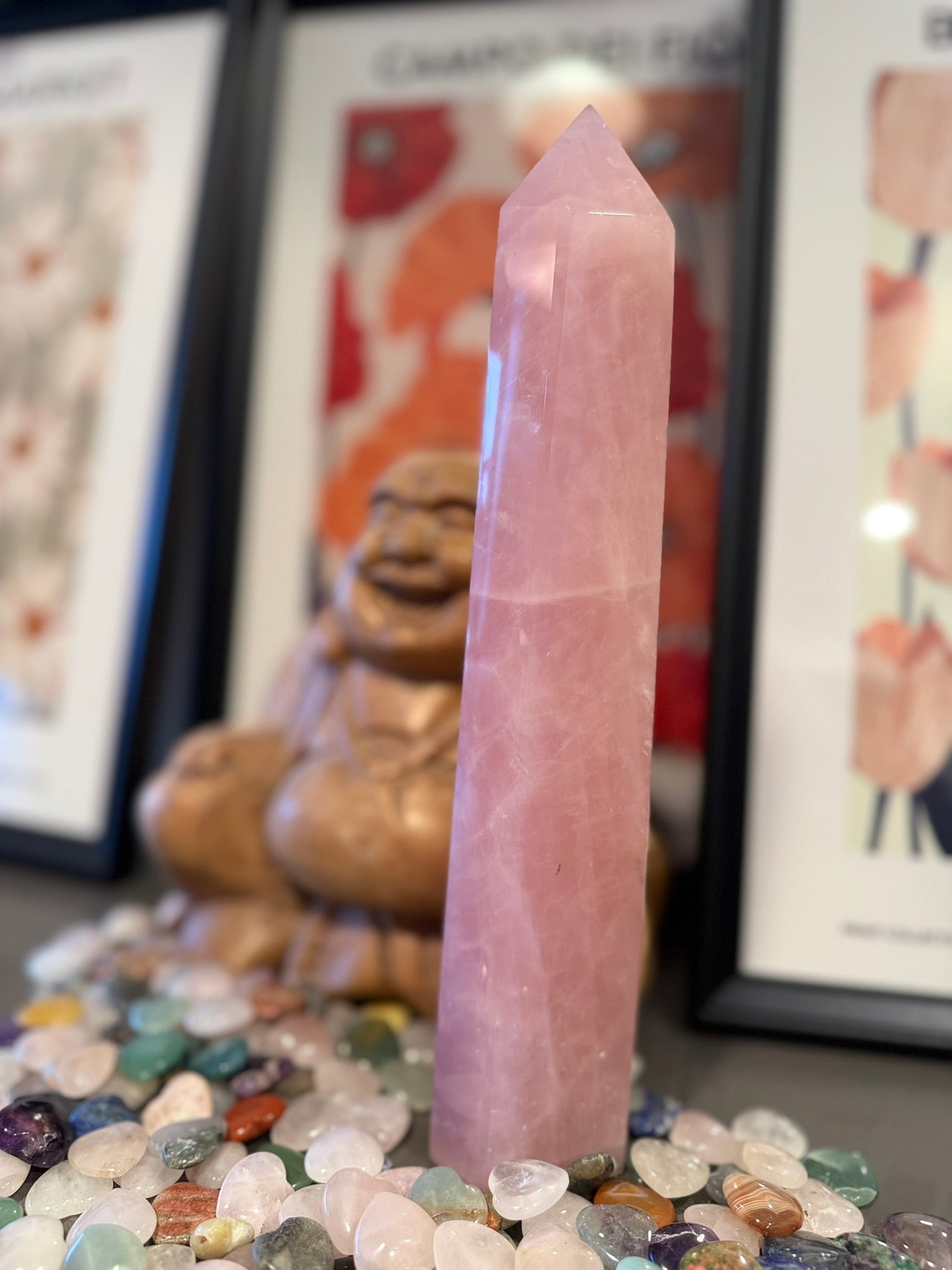 Enhance your heart, mind, and soul with the XL Rose Quartz Tower - Statement. This powerful crystal purifies and opens your heart on all levels, promoting deep inner healing and self-love. Use it during times of distress for a calming and reassuring effect. Rose Quartz effortlessly eliminates negative energy and replaces it with loving vibes, while also increasing empathy and sensitivity. Let this stone guide you towards self-forgiveness, self-acceptance, self-trust, and self-worth.